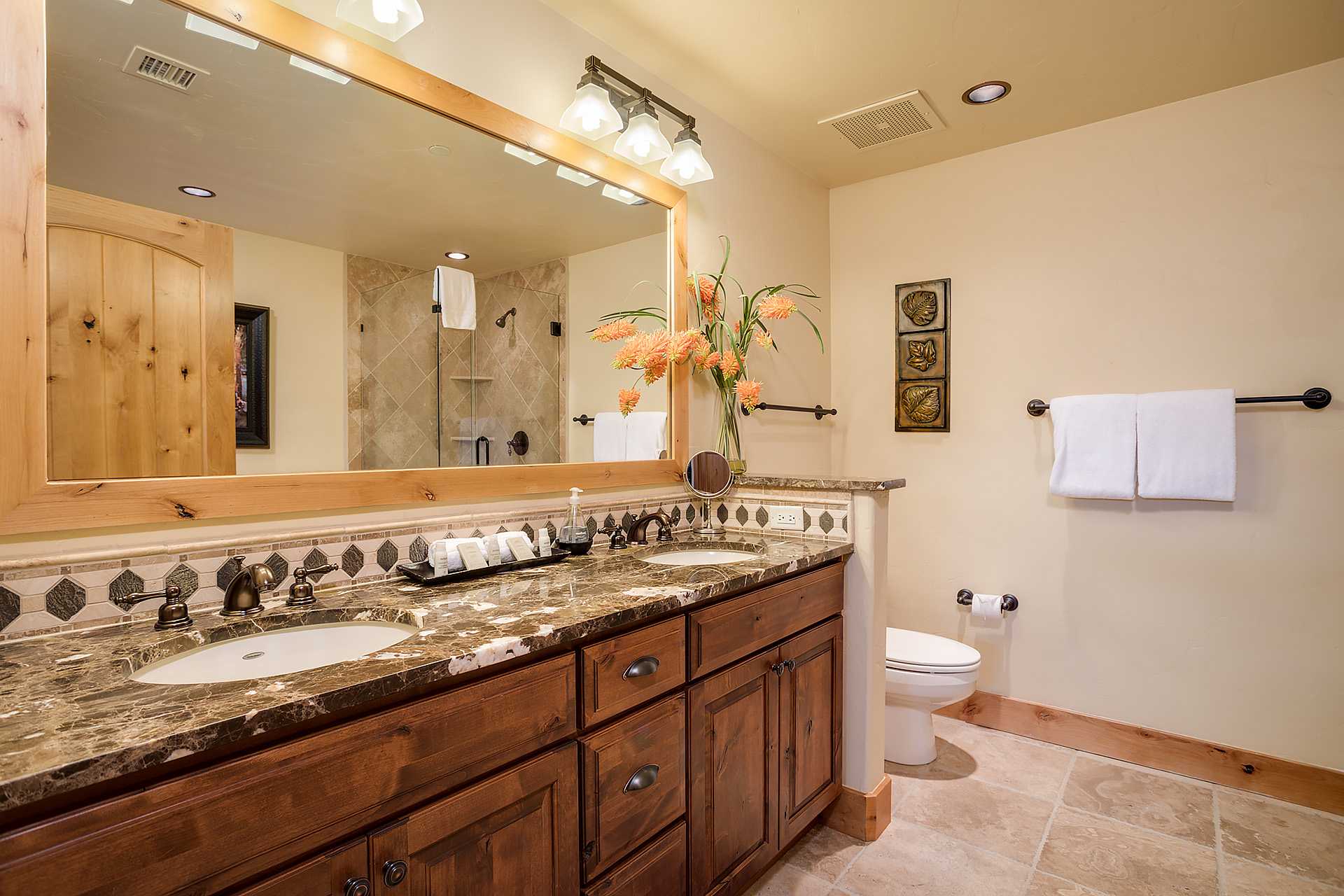 The lovely master bedroom has a king bed, spa like master bath with jetted tub and walk-in shower. The 2nd bedroom has a queen bed and attached private bathroom, and the 3rd internal bedroom is perfect for the kids! Cozy but spacious, with a twin bed plus twin over twin bunkbed, sleeping three. The third ensuite bathroom truly makes it possible for everyone to have their own space when getting ready for a day filled with mountain activities.