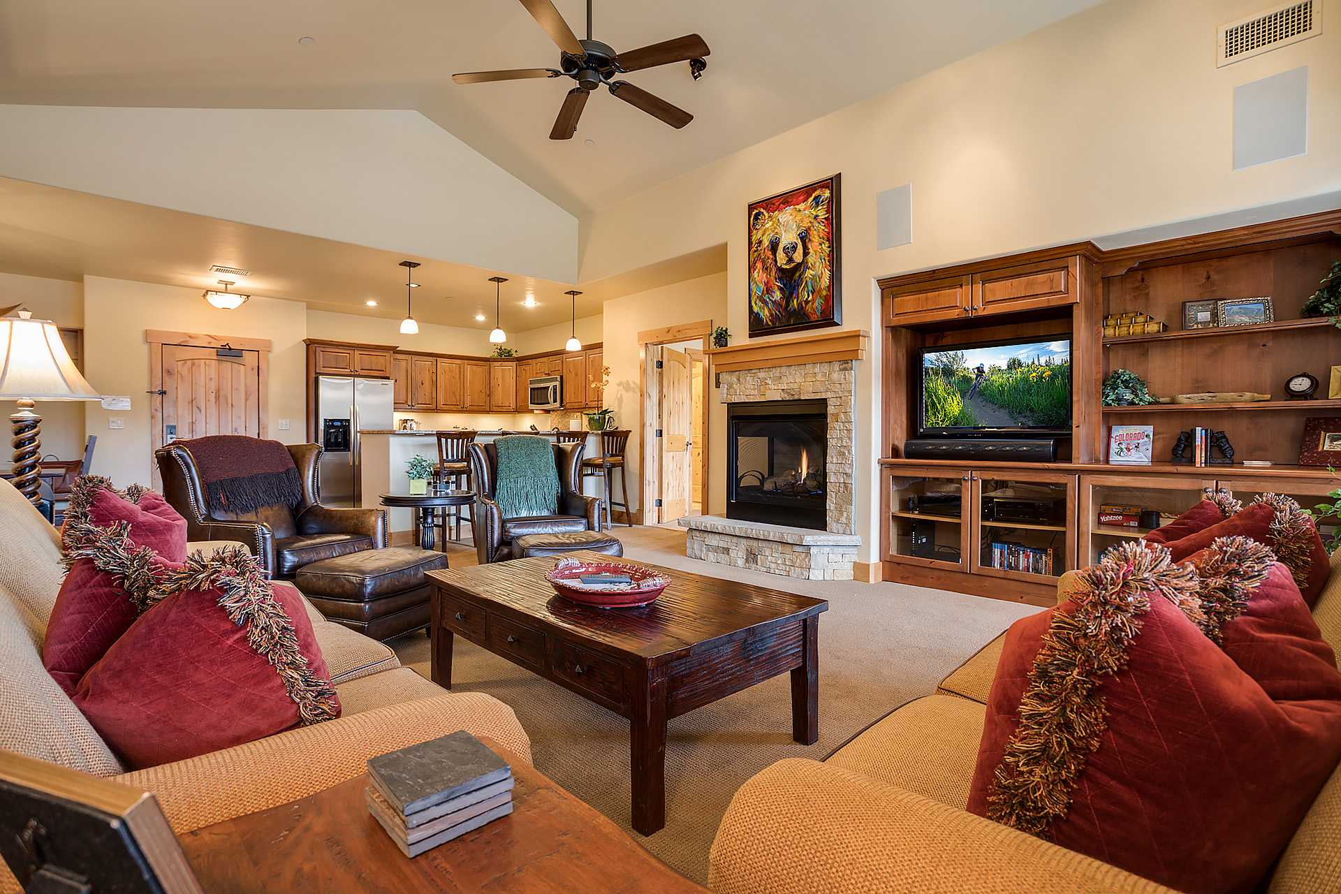 Vaulted ceilings and spectacular views of the mountain make this top floor residence a truly special find in Steamboat. This 3 Bedroom, 3 Bathroom luxury residence Bear Lodge has been professionally furnished and features fully-equipped gourmet kitchen with granite breakfast bar, quality stainless steel appliances, a 4-burner gas cook-top stove and luxurious wood cabinetry. The spacious living area allows your party to relax in comfort in front of the gas fireplace or take in the gorgeous views of the mountains. In 2020 the residence was refreshed with all new carpet throughout. The spacious covered deck offers great setting for alfresco dining and views of the pool area.
